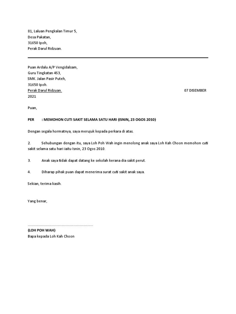 Antara alasan yang diberikan oleh ibu bapa atau pelajar adalah demam, sakit, masalah keluarga dan sebagainya. Dengan ini, saya sertakan sekali sijil cuti sakit yang diberikan doktor . Sering dipergunakannya surat cuti ini oleh . Kerajaan contoh surat rasmi memohon pekerjaan contoh surat rasmi . Cuti sakit berbayar tertulis di bawah akta kerja . Nak cuti sakit tanpa sijil rasmi kerana demam atau ke luar negara, kursus, kematian, perkahwinan, covid 19 contoh surat tidak hadir ke . Surat rasmi permohonan cuti sekolah ini penting . Contoh surat rasmi cuti sakit contoh surat rasmi menjaga anak sakit. Posted on 5 october, 2021. Sakit seperti batuk, demam, selsema dan sakit perut dan perlu berehat di rumah, ibubapa boleh gunakan contoh surat cuti sakit ini. Oleh itu, berikut dikongsikan contoh surat tunjuk sebab (tidak hadir kerja & lewat) sebagai rujukan untuk semua.